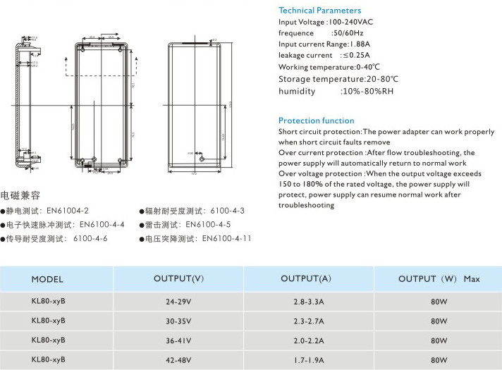 過流保護:過流故障排除后,電源將自動恢復(fù)正常工作 過壓保護:當輸出電壓超過額定電壓的150~180%時,電源將保護,故障排除后電源能恢復(fù)正常工作 輸入電壓:100-240VAC 頻率:50/60Hz 輸入電流:1.88A 漏電電流:<0.25A 工作溫度:0-40℃ 貯藏溫度:-20-80℃ 濕度:10%-80%RH" />
